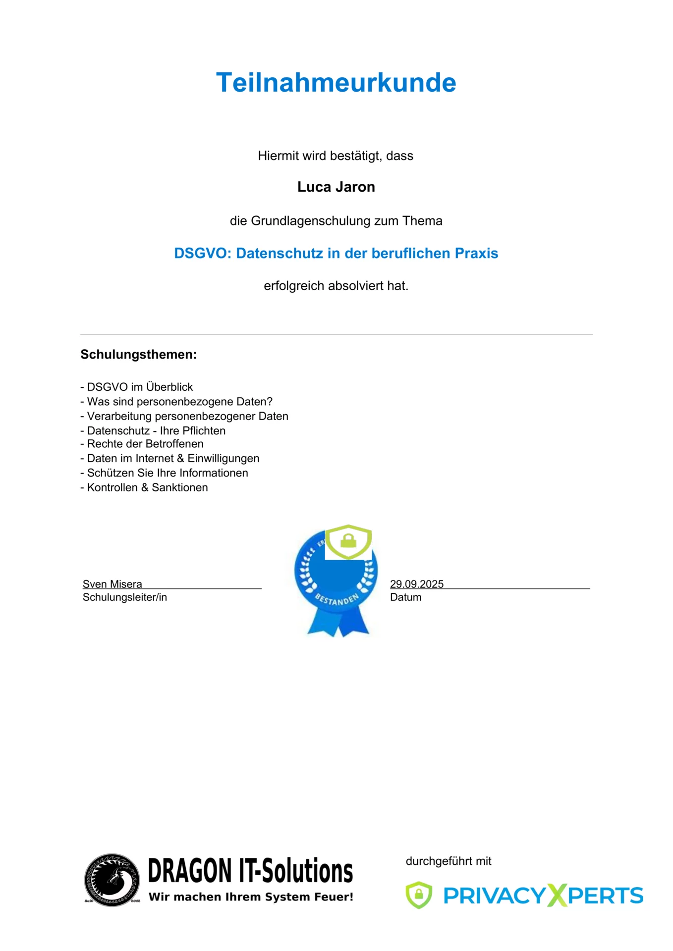 - Offizielle Bestätigung (Zertifikat) der erworbenen Kenntnisse für jeden Teilnehmer
